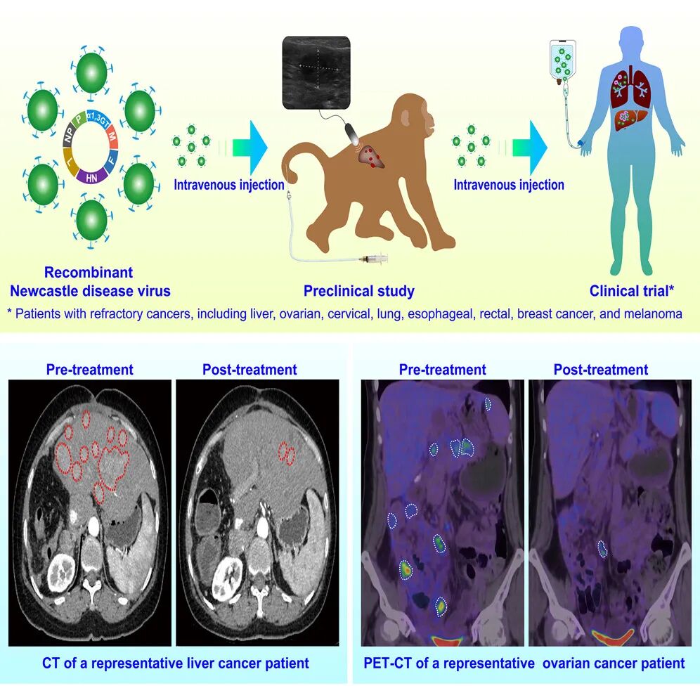 研究思路與方法 1 1. 研究思路 針對(duì)溶瘤病毒在臨床應(yīng)用中存在的問(wèn)題,研究團(tuán)隊(duì)提出了一種創(chuàng)新思路:利用基因工程技術(shù),將豬源α1,3半乳糖基轉(zhuǎn)移酶基因(α1,3GT)整合到新城疫病毒(Newcastle Disease Virus,NDV)基因組中,構(gòu)建重組新城疫病毒NDV-GT。NDV-GT能夠在腫瘤細(xì)胞中表達(dá)αGal抗原,讓免疫系統(tǒng)將腫瘤識(shí)別為外來(lái)的豬器官,從而觸發(fā)超急性排斥反應(yīng),增強(qiáng)抗腫瘤免疫反應(yīng)。 1 2. 研究方法 2.1 病毒構(gòu)建與表征 研究團(tuán)隊(duì)利用基因工程技術(shù),將豬源α1,3GT基因整合到NDV基因組中,構(gòu)建NDV-GT病毒。通過(guò)病毒滴定、基因組測(cè)序等方法對(duì)NDV-GT進(jìn)行表征,確保其遺傳穩(wěn)定性和生物安全性。 2.2 臨床前研究 建立人肝癌異種移植模型,通過(guò)超聲引導(dǎo)下經(jīng)靜脈給藥的方式,將NDV-GT病毒注射到模型動(dòng)物體內(nèi)。 利用RayBio的蛋白芯片產(chǎn)品對(duì)腫瘤組織中的蛋白質(zhì)表達(dá)譜進(jìn)行分析,探索NDV-GT病毒的抗腫瘤機(jī)制。通過(guò)比較不同治療組腫瘤組織中蛋白質(zhì)表達(dá)水平的差異,發(fā)現(xiàn)NDV-GT病毒能夠顯著激活機(jī)體的免疫系統(tǒng),促進(jìn)腫瘤細(xì)胞的凋亡和清除。 對(duì)NDV-GT病毒的安全性進(jìn)行評(píng)估,包括病毒檢測(cè)、血常規(guī)和生化指標(biāo)檢測(cè)以及組織學(xué)檢查等。 2.3 臨床試驗(yàn)設(shè)計(jì) 在臨床前研究的基礎(chǔ)上,研究團(tuán)隊(duì)發(fā)起了一項(xiàng)臨床試驗(yàn),招募了23名難治性癌癥患者,包括肝癌、卵巢癌、宮頸癌、肺癌、食管癌、直腸癌、乳腺癌和黑色素瘤。這些患者每周接受一次NDV-GT靜脈注射,持續(xù)8-12周。通過(guò)PET-CT、CT、MRI等影像學(xué)手段評(píng)估腫瘤的縮小情況,并使用免疫學(xué)指標(biāo)評(píng)估患者的免疫反應(yīng)。