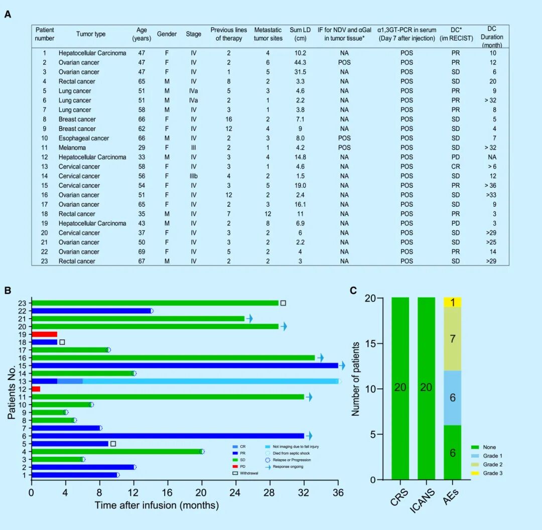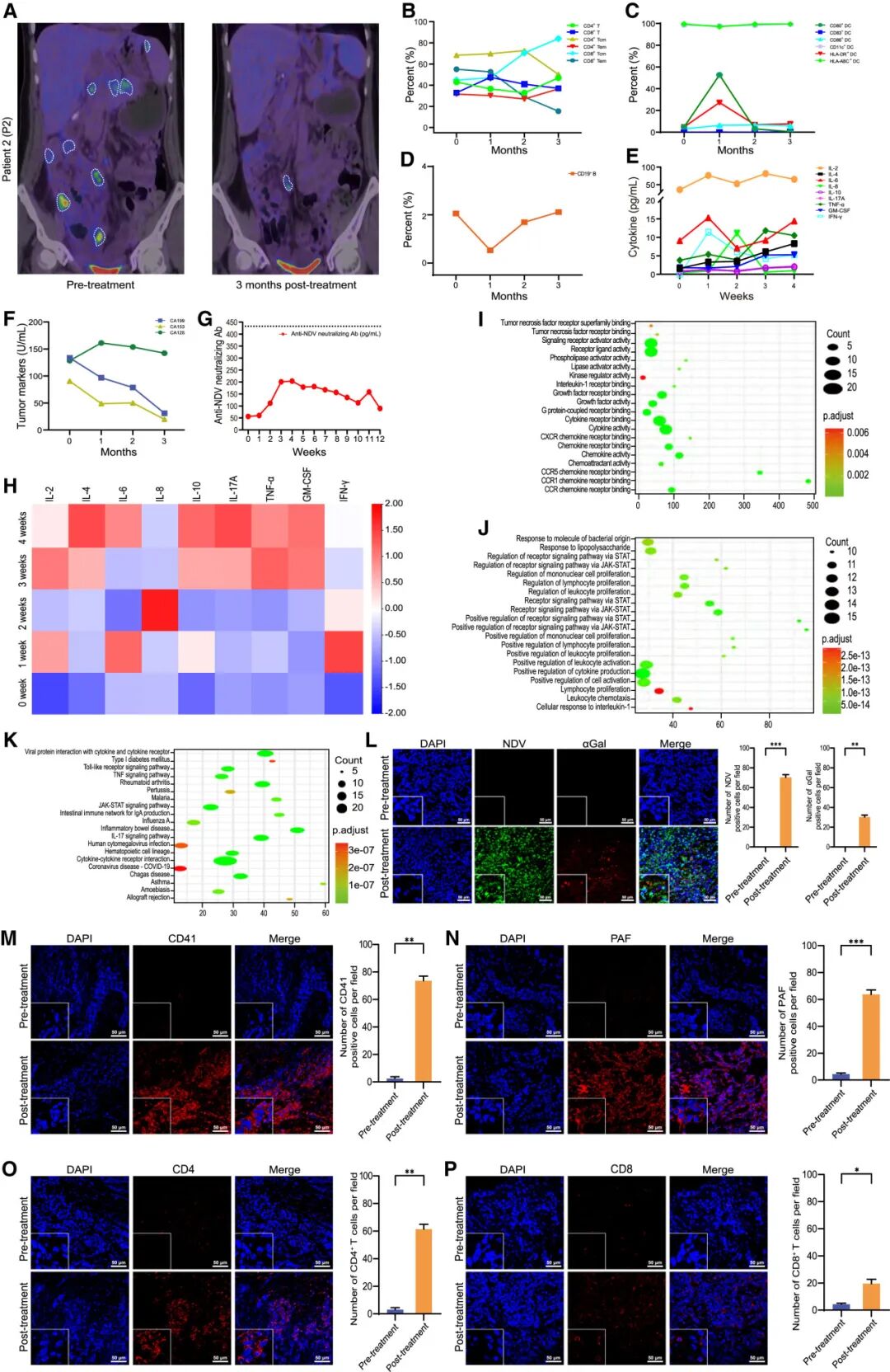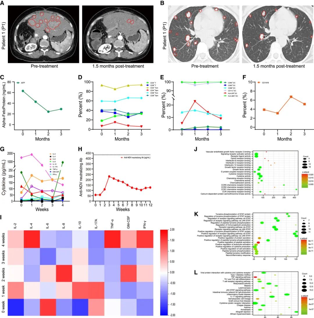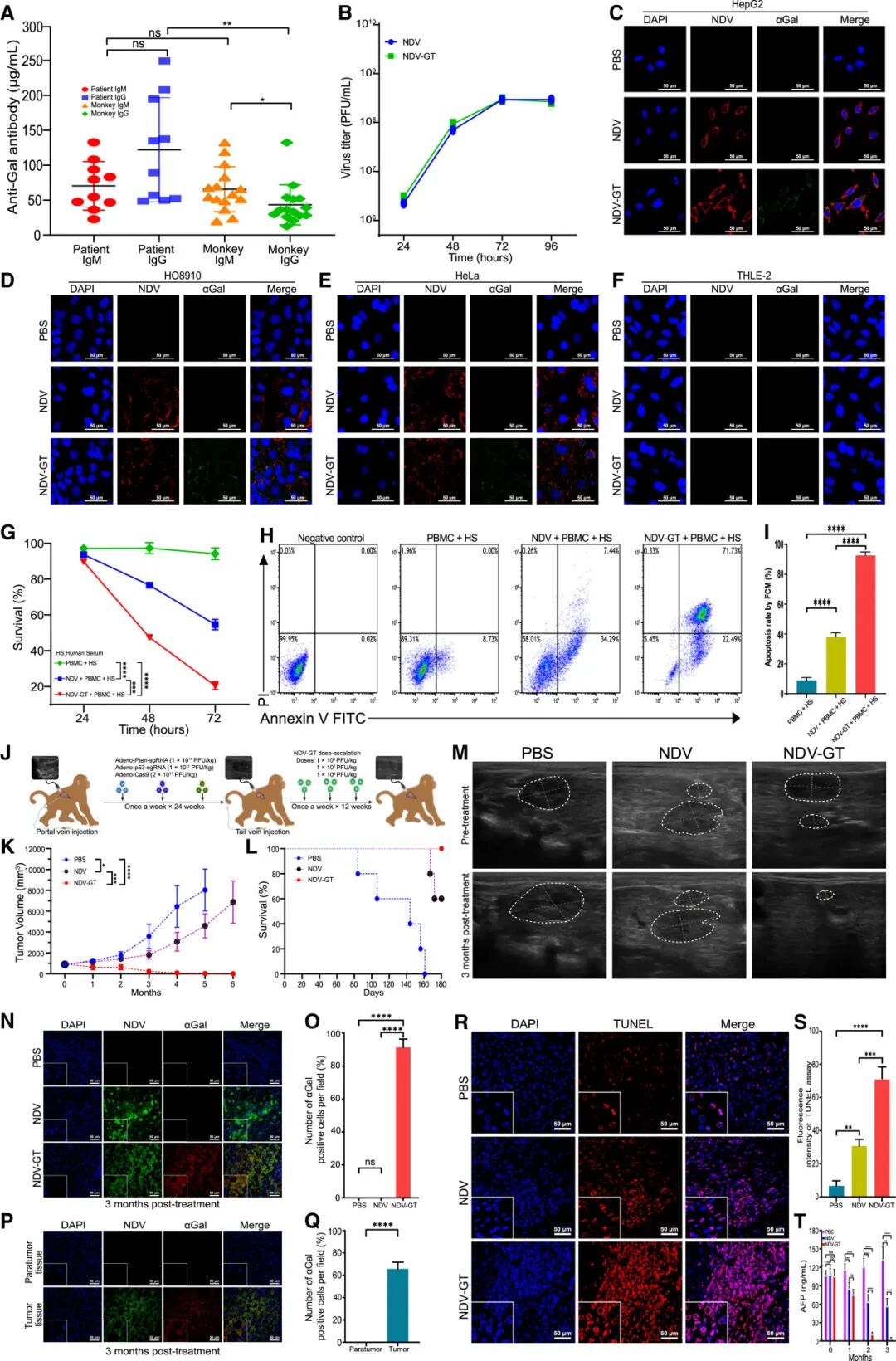 研究結(jié)果分析 1 1. 細(xì)胞與動(dòng)物實(shí)驗(yàn)結(jié)果 細(xì)胞實(shí)驗(yàn): NDV-GT是通過(guò)反向遺傳技術(shù)將豬α1,3-GT基因插入NDV序列生成的,經(jīng)PCR和測(cè)序確認(rèn)基因成功插入且保留復(fù)制能力。實(shí)驗(yàn)顯示,NDV-GT能特異性感染多種腫瘤細(xì)胞(如HepG2、HO8910、HeLa、A549、TE-10、SK-MEL-2、MDA-MB-231、LS513等),并在這些細(xì)胞中有效表達(dá)外源性α1,3-GT基因,同時(shí)對(duì)正常肝細(xì)胞(THLE-2)感染和侵襲性極小。與親本NDV相比,NDV-GT對(duì)腫瘤細(xì)胞(如HepG2)的增殖抑制和凋亡誘導(dǎo)能力更強(qiáng),這歸因于αGal增強(qiáng)的裂解能力。這些結(jié)果表明NDV-GT具有作為腫瘤治療藥物的潛力。 動(dòng)物實(shí)驗(yàn)結(jié)果 在CRISPR誘導(dǎo)的食蟹猴肝癌模型中,NDV-GT(新城疫病毒-基因治療型)展現(xiàn)出顯著的溶瘤效果。通過(guò)肝內(nèi)門(mén)靜脈注射CRISPR-Cas9誘導(dǎo)肝腫瘤后,靜脈注射NDV-GT,腫瘤內(nèi)綠色熒光細(xì)胞在72小時(shí)達(dá)到峰值,96小時(shí)仍廣泛分布。治療后第三個(gè)月,NDV-GT組腫瘤顯著縮小,停藥3個(gè)月后腫瘤完全消失,所有猴子存活。相比之下,NDV組腫瘤生長(zhǎng)延遲但停藥后反彈,PBS組平均存活時(shí)間僅4個(gè)月。機(jī)制上,NDV-GT誘導(dǎo)腫瘤內(nèi)血栓形成、血管閉塞及補(bǔ)體沉積,引發(fā)超急性排斥反應(yīng),并通過(guò)Akt-IKK-NF-kB途徑介導(dǎo)細(xì)胞凋亡,下調(diào)相關(guān)蛋白磷酸化并上調(diào)胱天蛋白酶。這表明NDV-GT通過(guò)直接裂解腫瘤細(xì)胞、引發(fā)超急性排斥反應(yīng)和激活免疫反應(yīng)實(shí)現(xiàn)腫瘤消退。 fig. 1 2 臨床試驗(yàn)結(jié)果 在23名難治性癌癥患者的臨床試驗(yàn)中,20名患者完成了治療并進(jìn)行了療效評(píng)估。結(jié)果顯示,NDV-GT治療顯著增強(qiáng)了患者的免疫反應(yīng),包括T細(xì)胞和樹(shù)突狀細(xì)胞的激活,以及多種細(xì)胞因子的分泌。在疾病控制率(DCR)方面,達(dá)到90%(1例完全緩解,6例部分緩解,11例病情穩(wěn)定)。在安全性方面,NDV-GT治療未引發(fā)嚴(yán)重副作用,患者的中和抗體水平雖有輕微上升,但仍在正常范圍內(nèi),未影響治療效果。 具體分為四種類型: (1)完全緩解(CR):1例患者腫瘤完全消失,且持續(xù)4周以上無(wú)復(fù)發(fā)。 (2)部分緩解(PR):6例患者腫瘤體積縮小超過(guò)30%,且持續(xù)4周以上。 (3)病情穩(wěn)定(SD):11例患者腫瘤體積縮小不超過(guò)30%或增大不超過(guò)20%,且未出現(xiàn)新的病灶。 (4)疾病進(jìn)展(PD):2例患者腫瘤體積增大超過(guò)20%或出現(xiàn)新的病灶。 此外,研究團(tuán)隊(duì)還觀察了NDV-GT對(duì)特定腫瘤類型的影響。以原發(fā)性肝細(xì)胞癌(HCC)為例,在接受NDV-GT治療1.5個(gè)月后,患者體內(nèi)的腫瘤結(jié)節(jié)縮小甚至消失,甲胎蛋白(AFP)水平顯著降低,表明腫瘤進(jìn)展受到抑制。此外,對(duì)治療后免疫指標(biāo)的分析表明,NDV-GT增強(qiáng)了適應(yīng)性免疫,重新激活了免疫記憶系統(tǒng),緩解免疫抑制或免疫逃逸,引發(fā)天然抗腫瘤免疫,并發(fā)揮體液和細(xì)胞免疫療法(fig.5D-5F)。該治療還促進(jìn)了針對(duì)腫瘤的細(xì)胞因子分泌和免疫逃逸,而不會(huì)誘導(dǎo)細(xì)胞因子釋放綜合征(CRS)(fig.5G)。此外,NDV-GT除了炎癥略有增加外,不影響血液指標(biāo)或腎功能,因此表明其生物安全性。重要的是,治療后患者血液中抗NDV中和抗體的滴度略高于治療前,但仍在正常對(duì)照值范圍內(nèi)(fig.5H)。細(xì)胞因子抗體芯片(QAH-INF-3)分析進(jìn)一步證實(shí)了細(xì)胞因子的激活,并揭示了激活的細(xì)胞因子參與JAK-STAT信號(hào)通路的正向調(diào)節(jié),該通路調(diào)節(jié)病毒蛋白與細(xì)胞因子/細(xì)胞因子受體之間的相互作用(fig.5I-5L)。基于總體反應(yīng)(OR)差異的生存分析表明,NDV-GT有效地治療了快速達(dá)到PR并在10個(gè)月內(nèi)保持穩(wěn)定的HCC患者。 fig. 5 對(duì)P2卵巢癌癥組織的治療后分析顯示,NDV-GT和aGal表達(dá)顯著增殖(fig. 6L)。這種表達(dá)引發(fā)了超急性排斥反應(yīng),進(jìn)而促進(jìn)了血栓形成(fig.6M和6N)。此外,腫瘤組織中T淋巴細(xì)胞明顯浸潤(rùn)(fig.6O和6P),導(dǎo)致明顯的級(jí)聯(lián)擴(kuò)增溶瘤反應(yīng),有助于卵巢腫瘤的成功縮小甚至消失(fig.6A)。此外,根據(jù)imRECIST的評(píng)估,P2表現(xiàn)出持續(xù)12個(gè)月的快速PR,總生存期(OS)達(dá)到17個(gè)月。 fig. 6 此外,針對(duì)惡性黑色素瘤伴淋巴結(jié)轉(zhuǎn)移患者P11,在入組之前,她接受了手術(shù)治療和靶向治療。在接受了為期3個(gè)月的NDV-GT靜脈注射后,產(chǎn)生了4個(gè)月的穩(wěn)定期(fig.4A、4B)。隨后,她接受了手術(shù)以清除剩余的轉(zhuǎn)移瘤。目前,患者已穩(wěn)定超過(guò)32個(gè)月。 fig. 4 3 機(jī)制探討 NDV-GT能夠觸發(fā)超急性排斥反應(yīng),導(dǎo)致腫瘤血管栓塞和腫瘤壞死。同時(shí),NDV-GT還能增強(qiáng)免疫反應(yīng),不僅直接溶解腫瘤細(xì)胞,還通過(guò)激活體液和細(xì)胞免疫反應(yīng),增強(qiáng)了抗腫瘤效果。這些機(jī)制共同作用于腫瘤細(xì)胞,實(shí)現(xiàn)了顯著的抗腫瘤效果。 討論與小結(jié) 本研究開(kāi)發(fā)了一種基于新城疫病毒(NDV)的基因工程溶瘤病毒NDV-GT,通過(guò)引入豬源α1,3-半乳糖基轉(zhuǎn)移酶(a1,3GT)基因,誘